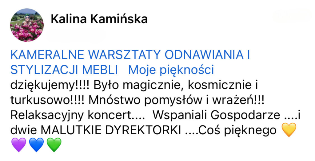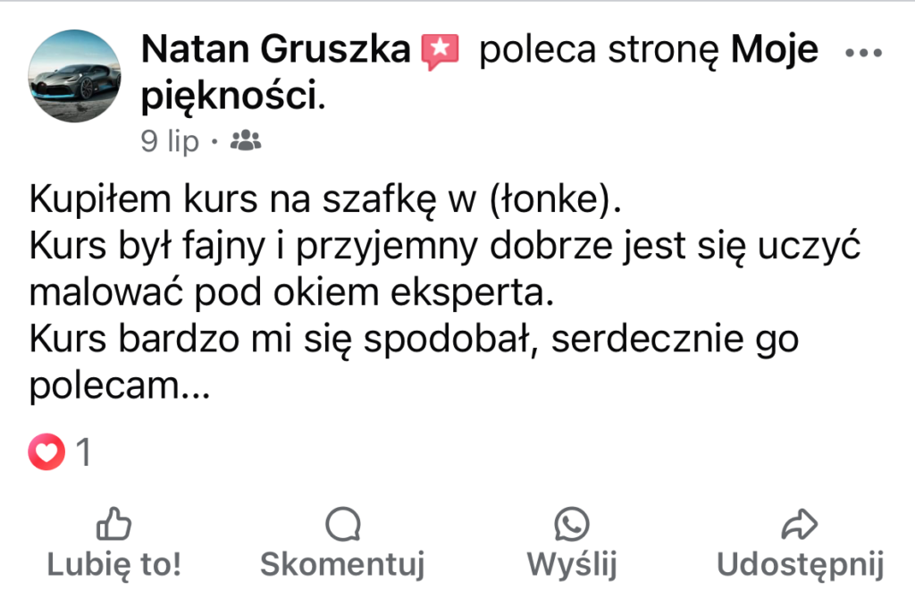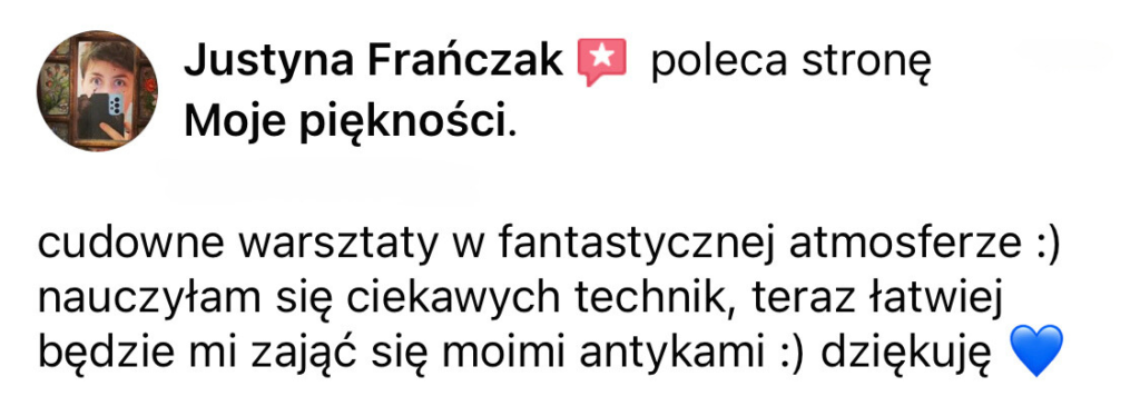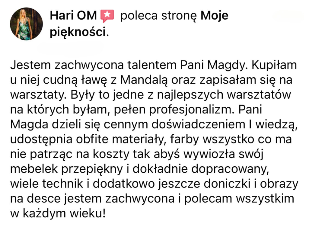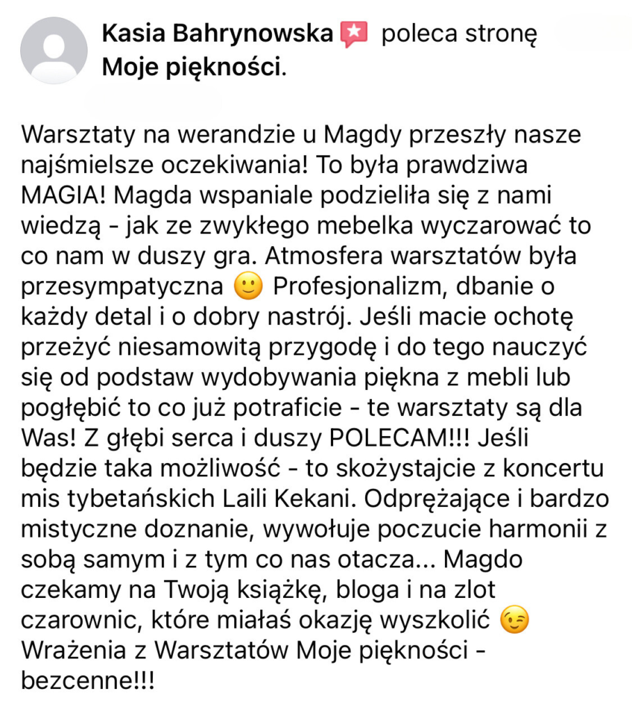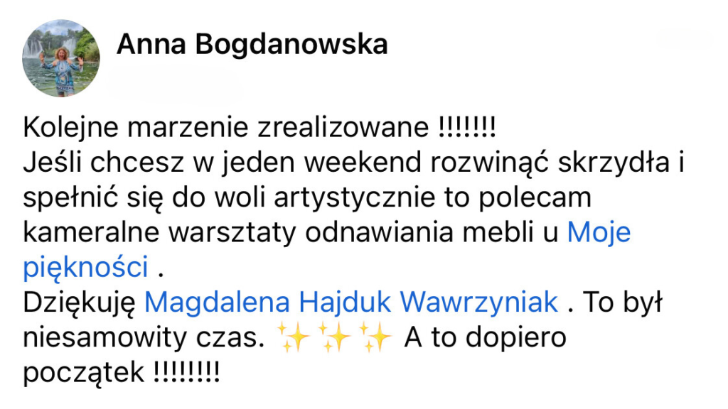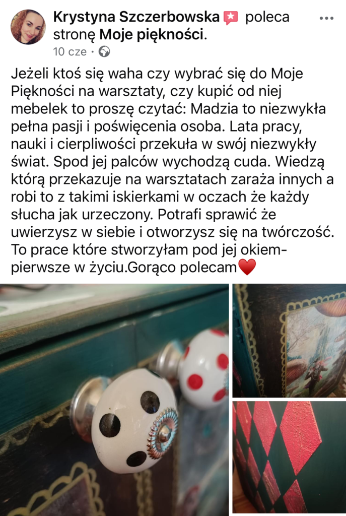 Od 7 lat zajmuję się odnawianiem i stylizacją mebli różnymi technikami. Przerobiłam już setki mebli, próbując wielu metod malowania i dekorowania, by znaleźć te, które naprawdę działają. Sporo rzeczy uczyłam się sama metodą prób i błędów, co pochłaniało mnóstwo czasu i energii. Teraz przekazuję Ci zebraną przez lata wiedzę, żebyś mogła od razu działać skutecznie i osiągać wymarzone efekty – bez zbędnego błądzenia. Jeśli Ty też chcesz poznać proste i sprawdzone techniki malowania mebli farbami kredowymi, zapraszam Cię do tego ebooka!